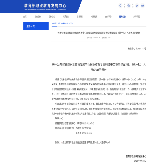 职业教育专业领域垂类模型建设项目(第一批)由教育部职业教育发展中心与中兴通讯股份有限公司联合发起,旨在贯彻落实《教育强国建设规划纲要(2024—2035年)》精神,推动职业教育与人工智能深度融合,促进教育教学模式创新,构建“技术驱动、产教融合、多方联动”的职业教育新生态。项目在全国范围内遴选专业建设水平较高、教师队伍优秀的高职院校,共同开展专业领域垂类模型及其应用体系建设。