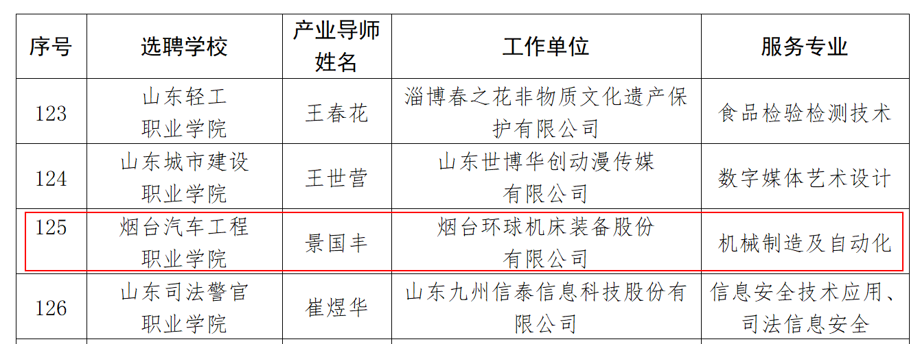 近日,山东省教育厅公布了2025年职业院校产业导师特聘人选名单,烟台汽车工程职业学院推荐的机械制造及自动化专业产业导师景国丰成功入选。
