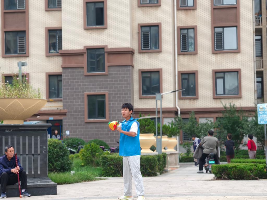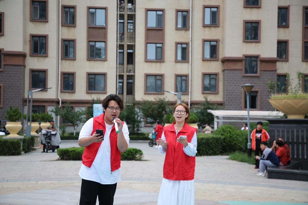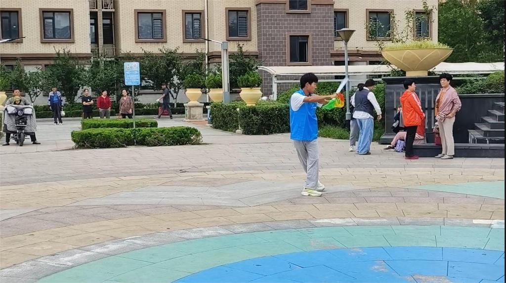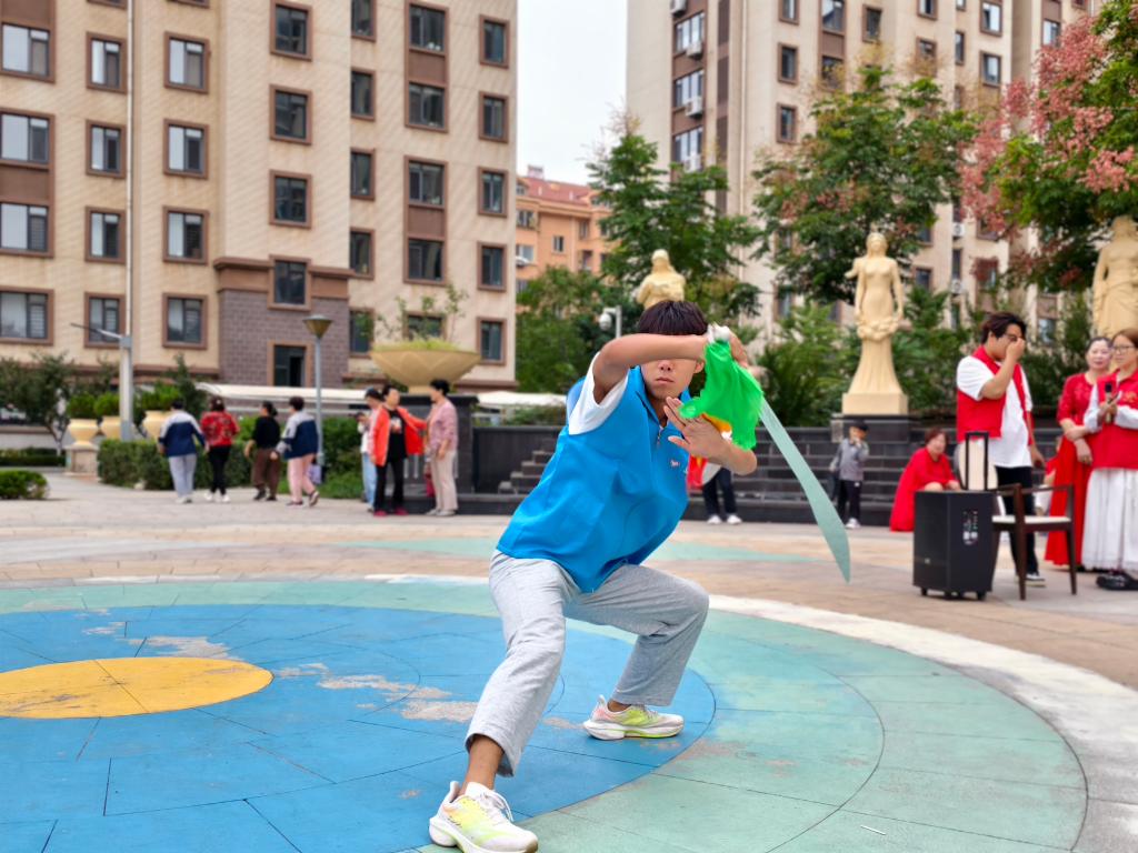 当天下午,服务队精心筹备,在社区居民联欢会上奉献了精彩的文艺节目。赵传睿同学表演的中华刀术,刚劲有力、气势如虹,展现了中华儿女的英勇与豪迈,引来满堂喝彩;陈智豪与石凤云同学的对唱,歌声悠扬,情感真挚,唱出了对美好生活的向往与对祖国的深情祝福。他们的表演为联欢会注入了青春的活力,将现场气氛推向高潮,赢得了社区居民的阵阵掌声。
